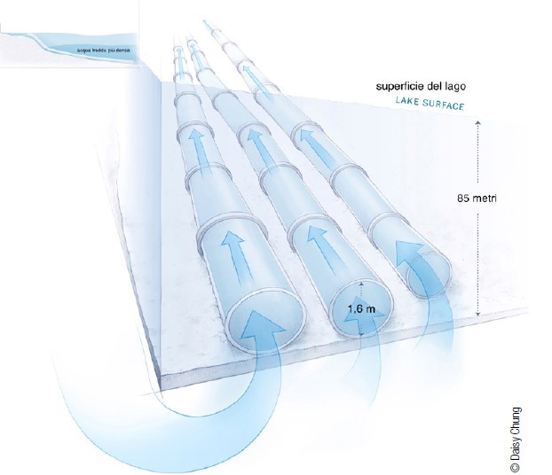 Il processo di raffreddamento della città inizia nel lago in un punto distante circa 5,5 km in direzione sud e a 85 metri di profondità dove l’acqua resta a una temperatura costante di 4 °C tutto l’anno. Essa viene aspirata attraverso tre tubi in polietilene ad alta densità con diametro di 1,6 metri appoggiati lungo il pendio naturale del fondo del lago e distanziati di circa 800 metri l’uno dall’altro (figura 5). I tre tubi si uniscono tra loro prima di entrare nell’impianto di trattamento dell’acqua situato su una delle Toronto Islands al largo della città (figura 6). Nell’espansione prevista verrà aggiunto un quarto tubo per aumentare la capacità del 60%.