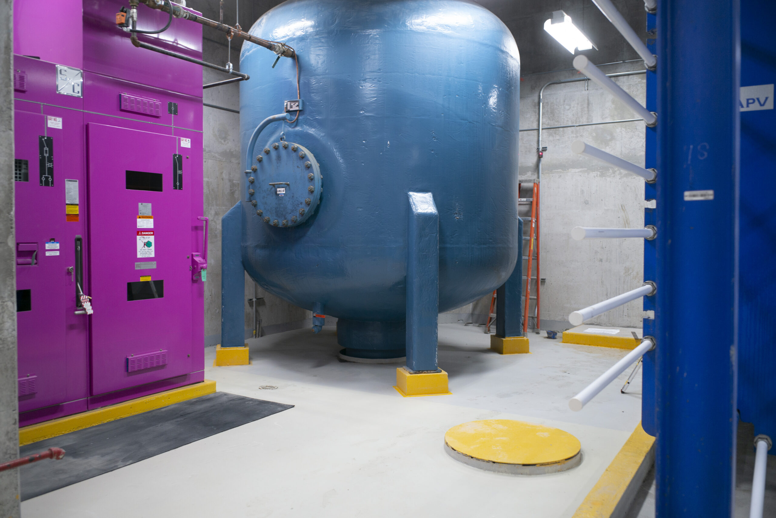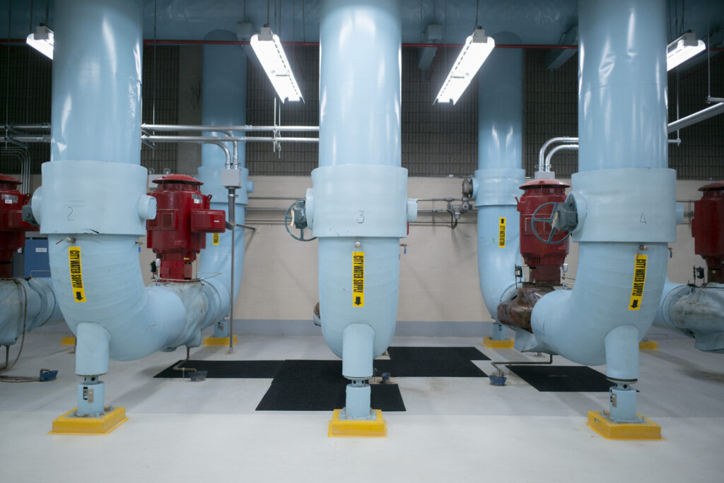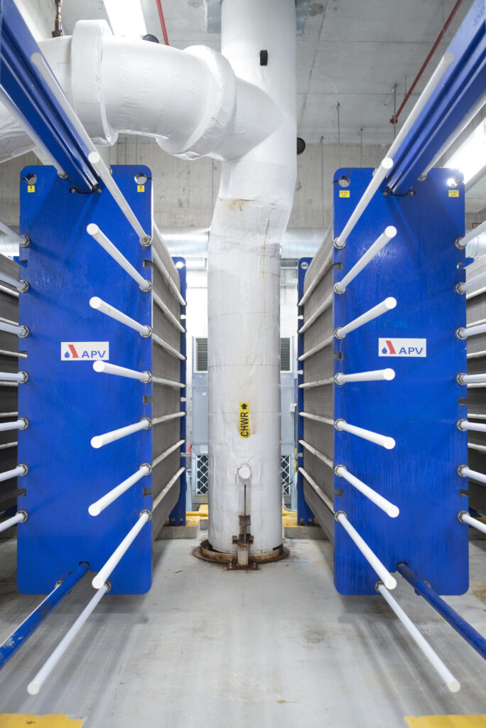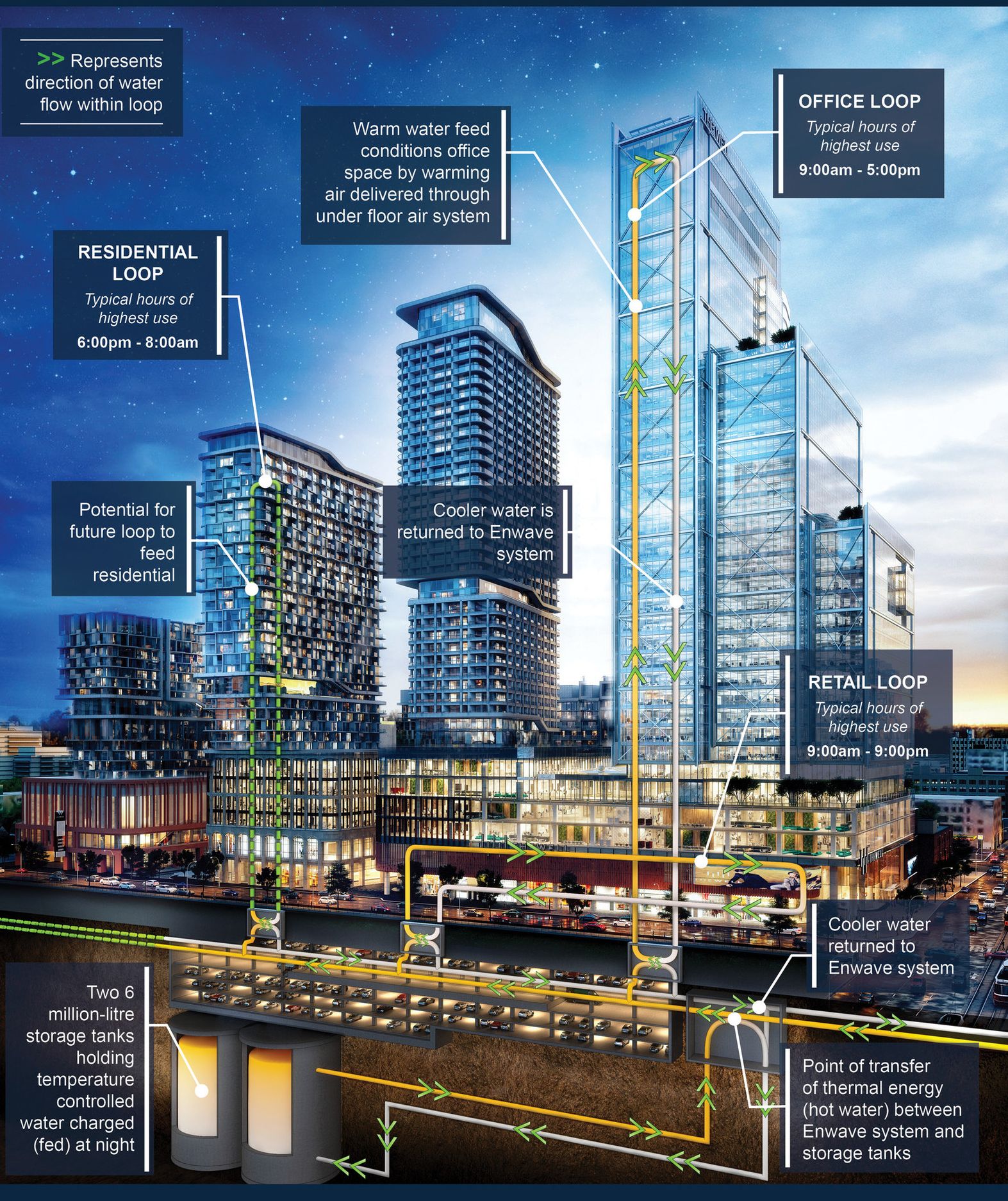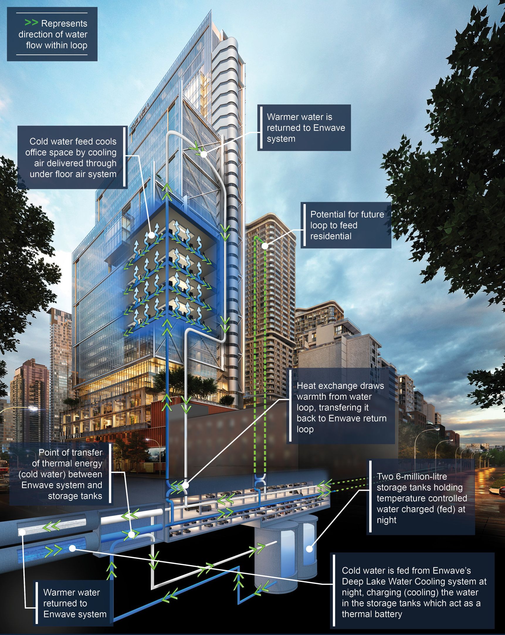 In un locale posto 43 metri sotto il livello più basso del sito di costruzione, un enorme serbatoio da 7,6 milioni di litri immagazzinerà acqua a temperatura controllata alimentata dalla rete urbana di teleraffreddamento che sfrutta l’acqua profonda del lago Ontario, di seguito descritta. La nuova rete di distribuzione di acqua calda ad alta efficienza di The Well sfrutterà anch’essa l’accumulo termico sul posto. Il sistema consentirà di immagazzinare energia durante le ore vuote in modo che essa possa essere distribuita ai clienti in base alla richiesta.