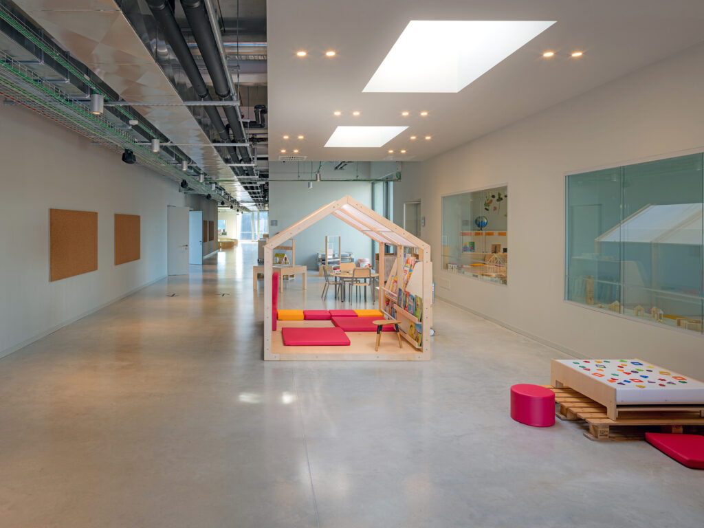 In particolare, nell’ed. H, gli impianti radianti provvedono al solo riscaldamento, mentre nel periodo estivo la mitigazione delle temperature e la deumidificazione sono ottenute con la ventilazione. Nelle aree di gioco le serpentine a pavimento sono state posate con modalità idonee all’impiego di pavimentazione di tipo flettente.