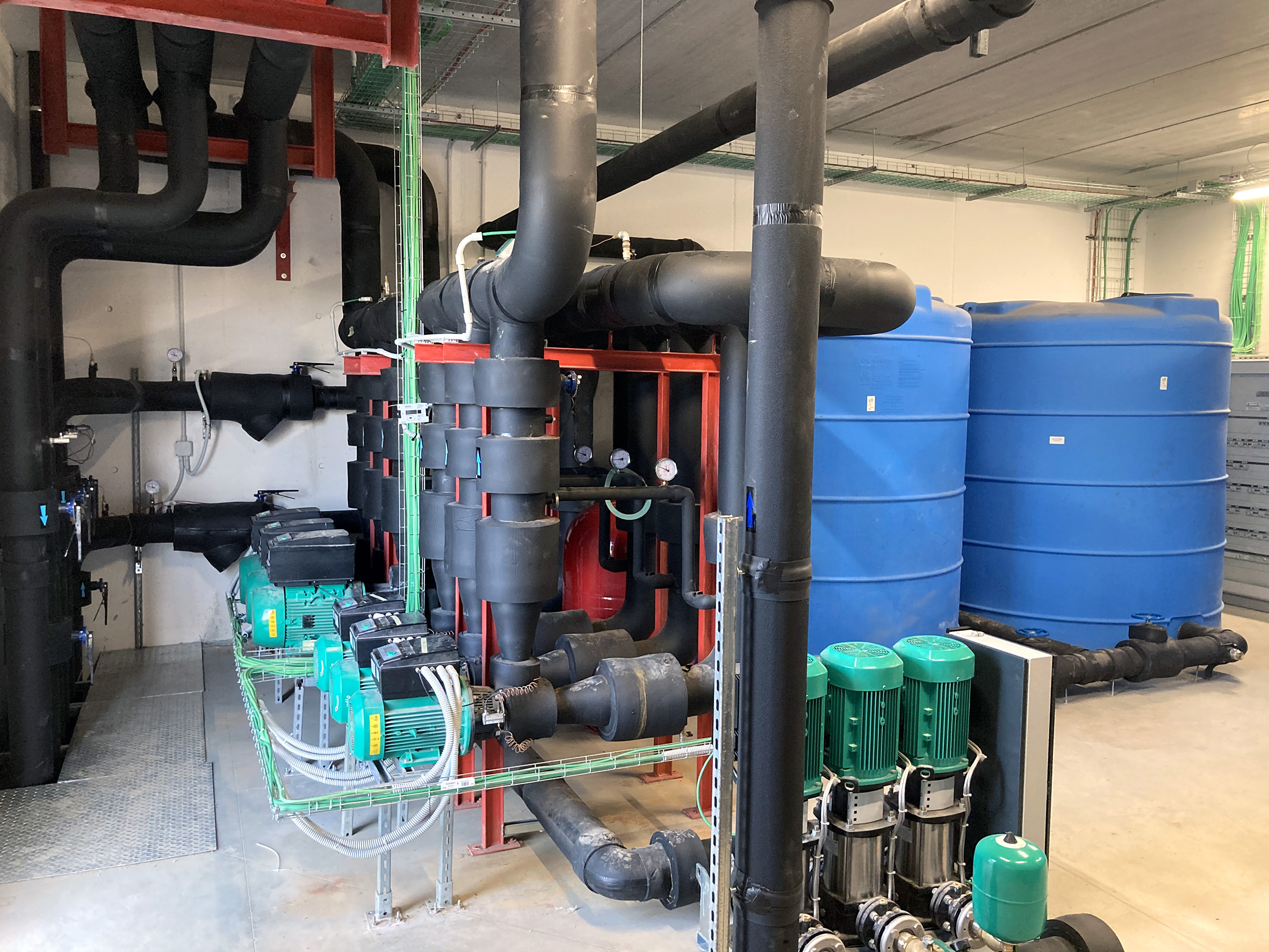 Per mantenere in pressione questa “smart grid idrica”, la centrale di pressurizzazione dispone di 2 gruppi di pompaggio dedicati (uno per il circuito di distribuzione ad anello e uno per il campo geotermico), composti ciascuno da 3 elettropompe (1 di riserva) alimentate tramite inverter (potenze comprese tra 7÷19 kW), che si aggiungono ai gruppi di pompaggio dedicati alla rete di distribuzione dell’impianto idrico-sanitario.