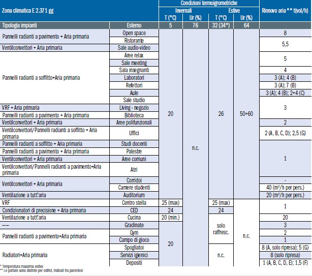 In generale, negli edifici a vocazione scolastica (A, B, C) e direzionale/formativo (D) si tratta di pannelli radianti a soffitto a bassa inerzia (fanno eccezione le palestre didattiche, dotate di pavimenti radianti), abbinati ad aria primaria a portata variabile, anche per il controllo dell’umidità in aule e laboratori didattici, uffici e studi, sale riunioni e meeting, refettori, biblioteca didattica, ecc. Nel connettivo sono previsti ventilconvettori a 2 tubi senza deumidificazione.