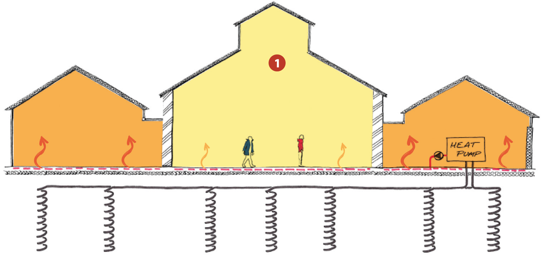 Un altro vantaggio di questa soluzione è che il calore rimosso dall’edificio viene immagazzinato nel terreno e ne aumenta la temperatura, di conseguenza in inverno le pompe di calore funzionano in modo efficiente per fornire energia termica. Per gli spazi individuali è stata effettuata la verifica del surriscaldamento.