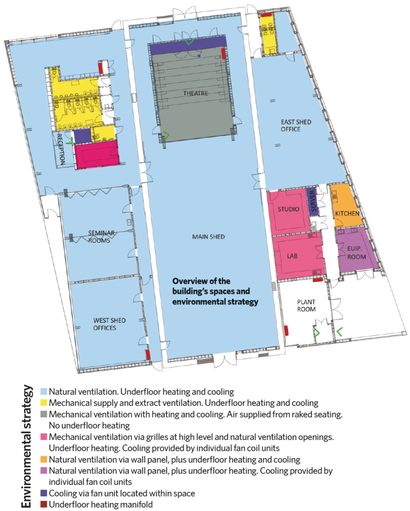Un sistema di ventilazione meccanica viene invece utilizzato per trattare il laboratorio e lo studio, con portate d’aria controllate in base ai livelli di CO2. Questi spazi sono dotati anche di fan coil per il raffreddamento. La sala conferenze è una struttura indipendente posta al centro del capannone principale e può essere aperta o chiusa per soddisfare un pubblico più o meno ampio (figura 3). La sala è l’unico spazio dell’edificio dotato di un impianto di riscaldamento ad aria calda tramite un’unità di trattamento dell’aria che provvede anche alla ventilazione (figura 4).