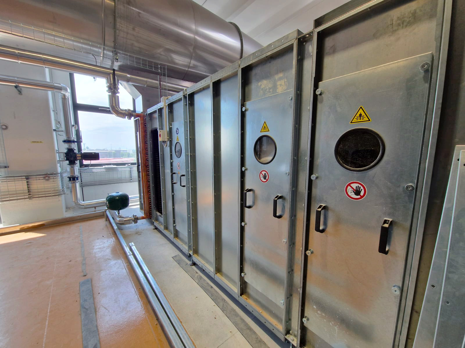Gli scambiatori aria-acqua sono a servizio delle unità di bilanciamento – condizionamento dei reparti, per fornire nel periodo invernale una capacità termica totale di circa 1.000 kW a preriscaldo dell’aria immessa nelle sale. A valle dei filtri e recuperatori di calore e prima dell’immissione aria nella batteria di deodorizzazione elettrostatica, sono previsti una batteria di lavaggio aria, scrubber orizzontali ad alta velocità predisposti per il controllo PH e Redox dell’acqua di vasca e le relative pompe per il dosaggio prodotti passivanti, idonei all’abbattimento dei COV.