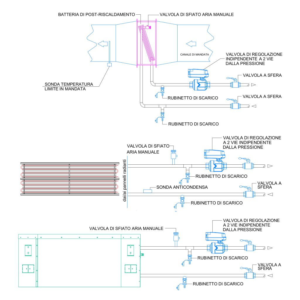 Ogni terminale sarà alimentato da stacchi in tubazioni multistrato di polietilene reticolato e alluminio e sarà dotato di valvole di rubinetto per svuotamento, valvola di intercettazione, sfiato, regolazione auto-bilancianti a 2 vie con funzionamento indipendente dalla pressione, più valvola termostatica per i radiatori.