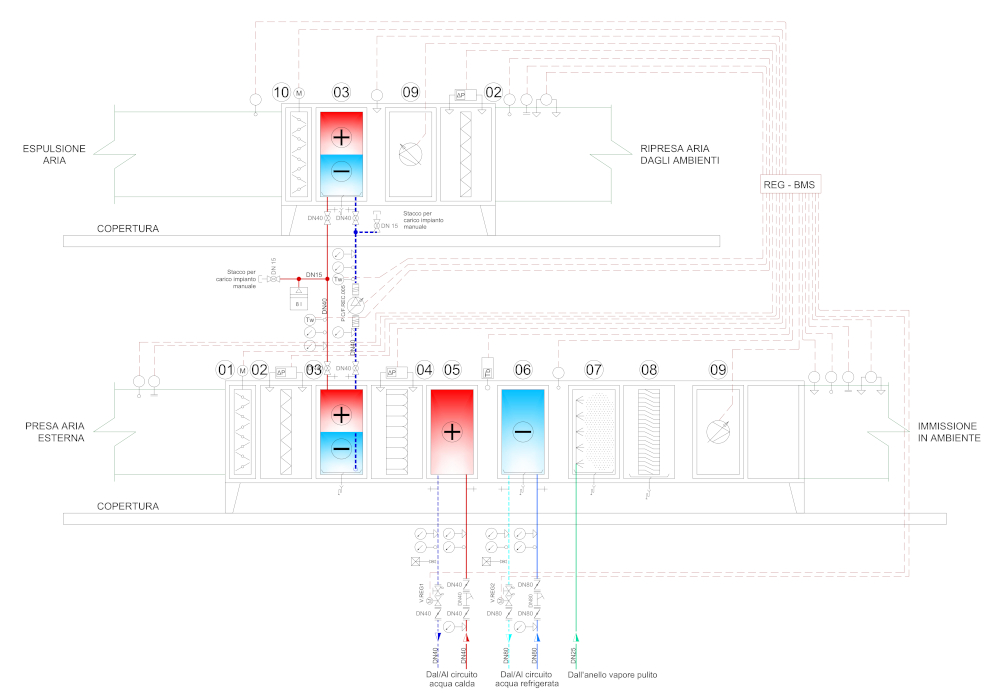 Le sezioni di ripresa prevedono silenziatore, filtrazione (M5), ventilatore, recuperatore di calore, silenziatore. Le canalizzazioni saranno realizzate con pannelli sandwich preisolati con superfici autopulenti e antimicrobiche. Percorreranno la copertura servendo direttamente i locali al livello 3, grazie ad asole realizzate nel solaio, e quindi i cavedi verticali fino alle diverse zone servite, proseguendo con dorsali interne ai controsoffitti dei corridoi e stacchi terminali ai diffusori mediante tubazioni flessibili isolate.