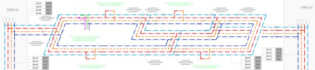 Le reti idrico-sanitarie saranno realizzate con tubazioni in pp-r per usi potabili (dorsali, colonne montanti, anelli di distribuzione ai piani) e multistrato (terminali utenze), secondo uno schema ad anello con sistema “venturi” per eliminare la possibilità di ristagno. Per il trattamento dell’acqua per il consumo umano sono previsti un dispositivo di dosaggio di biocida e l’impiego di shock termici periodici anti-legionella.