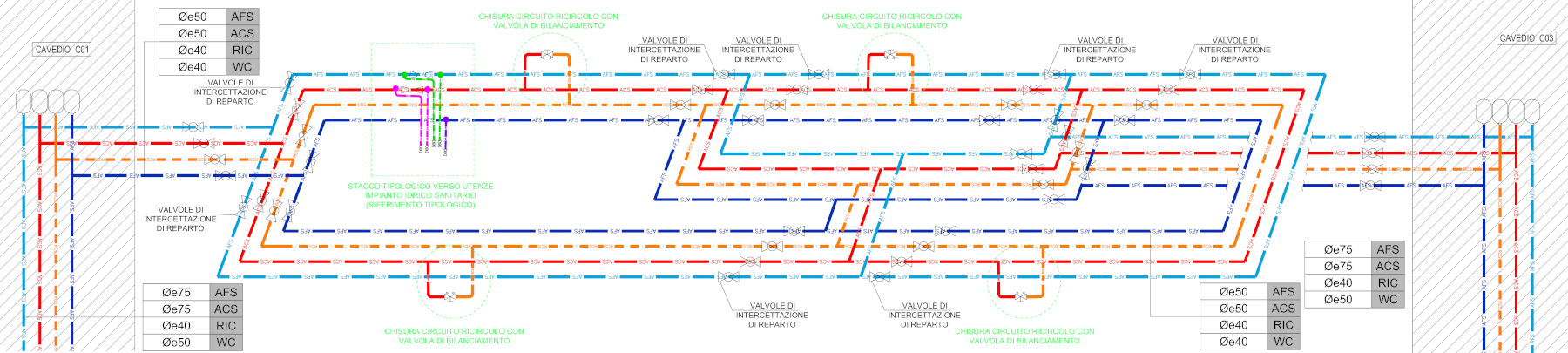 Ogni tratto di tubazione sarà alimentato da due diverse colonne montanti, garantendo la massima continuità del servizio.
