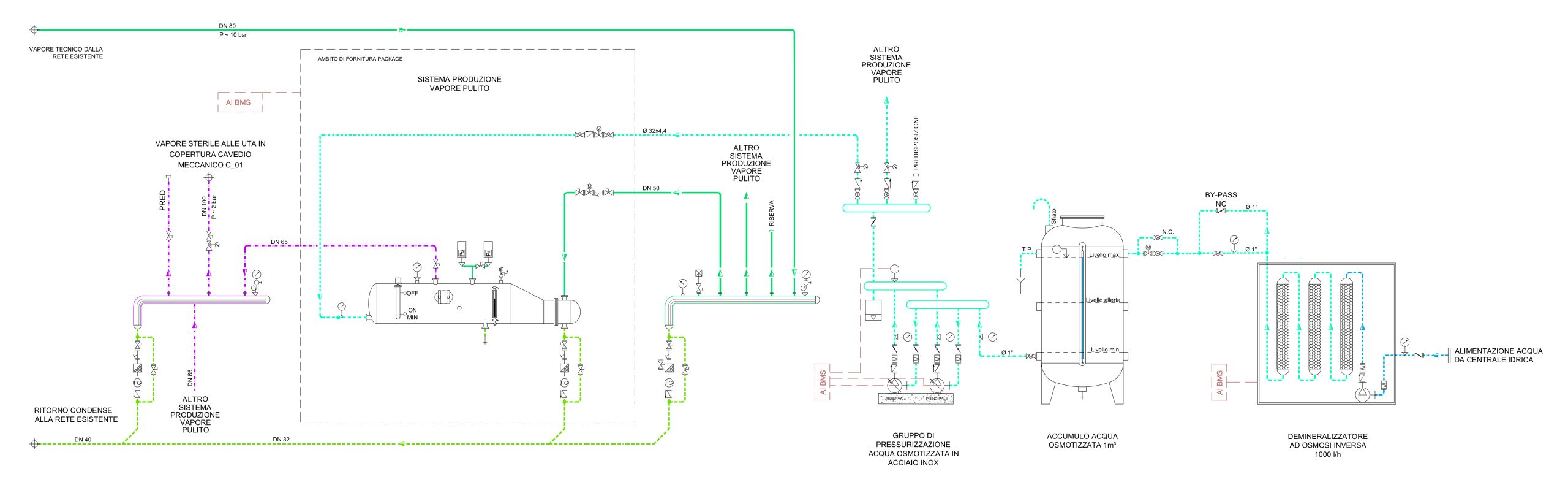 Un sistema di preparazione di acqua osmotizzata accoppiato a 2 generatori a fascio tubiero si occuperà della produzione del vapore pulito, sfruttando il calore di condensazione del vapore tecnico (lato primario) mediante scambio termico indiretto. La rete di scarico di reflui e condensa sarà distinta per acque nere e grigie, realizzata con tubazioni in polietilene ad alta densità o in polivinilcloruro pesante, con isolamento fonoassorbente, ed equipaggiata con ventilazione secondaria e bocche di ispezione nei tratti sub-orizzontali.