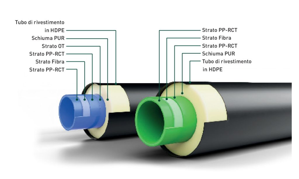 L’isolamento termico è affidato a una schiuma rigida in poliuretano (PUR), conforme ai requisiti della norma DIN EN 253, che assicura una struttura omogenea e una dimensione media delle celle inferiore a 0,5 mm. Tale caratteristica, combinata con le proprietà intrinseche del PP-RCT, riduce al minimo la dispersione termica e garantisce un rendimento costante anche in condizioni ambientali difficili.
