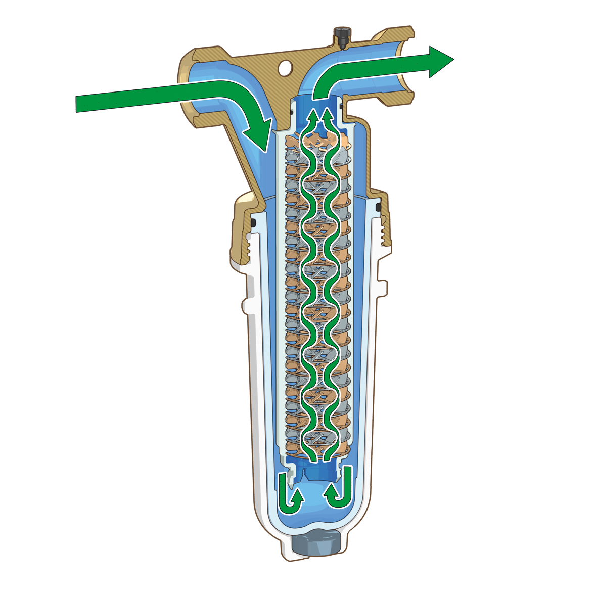 Realizzato in materiale antidezincificazione a bassissimo contenuto di piombo, non richiede elettricità e non necessita di sostituzioni o manutenzioni frequenti, a differenza di molti dispositivi anticalcare presenti sul mercato che possono richiedere ricariche periodiche e frequenti di polifosfati, granuli o sali. Il funzionamento è completamente meccanico e l’acqua in primis attraversa una maglia filtrante che cattura le particelle di impurità di dimensioni fino a 50 μm. Il filtro integrato rappresenta un importante vantaggio: consente di risparmiare tempo e spazio in fase di installazione e assicura un funzionamento ottimale, evitando che sabbia o particelle compromettano le prestazioni del dispositivo (figura 1).