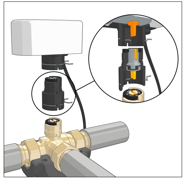 Il motore collocato frontalmente ne consente l’installazione direttamente sotto l’unità interna della pompa di calore: il flusso proveniente dalla pompa di calore viene deviato tra l’impianto di riscaldamento/condizionamento e quello di produzione ACS attraverso un servocomando che attua una rotazione di 90°. Il servocomando è disponibile in due versioni, con tempo di manovra 10 secondi e 40 secondi. Rimuovendo il servocomando, risulta visibile l’intaglio sulla sommità dell’asta di comando su cui agisce il perno del servomotore: