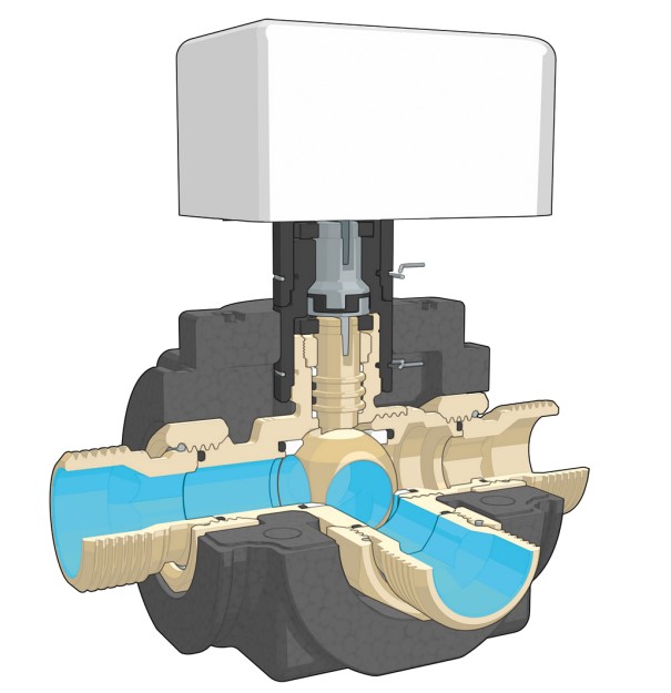 Il fatto che le tre vie della valvola siano in contatto tra loro garantisce una portata minima sempre disponibile alla pompa di calore durante l’intero periodo di manovra dell’otturatore sferico, in modo da evitare blocchi indesiderati della pompa di calore soprattutto nelle operazioni di sbrinamento.