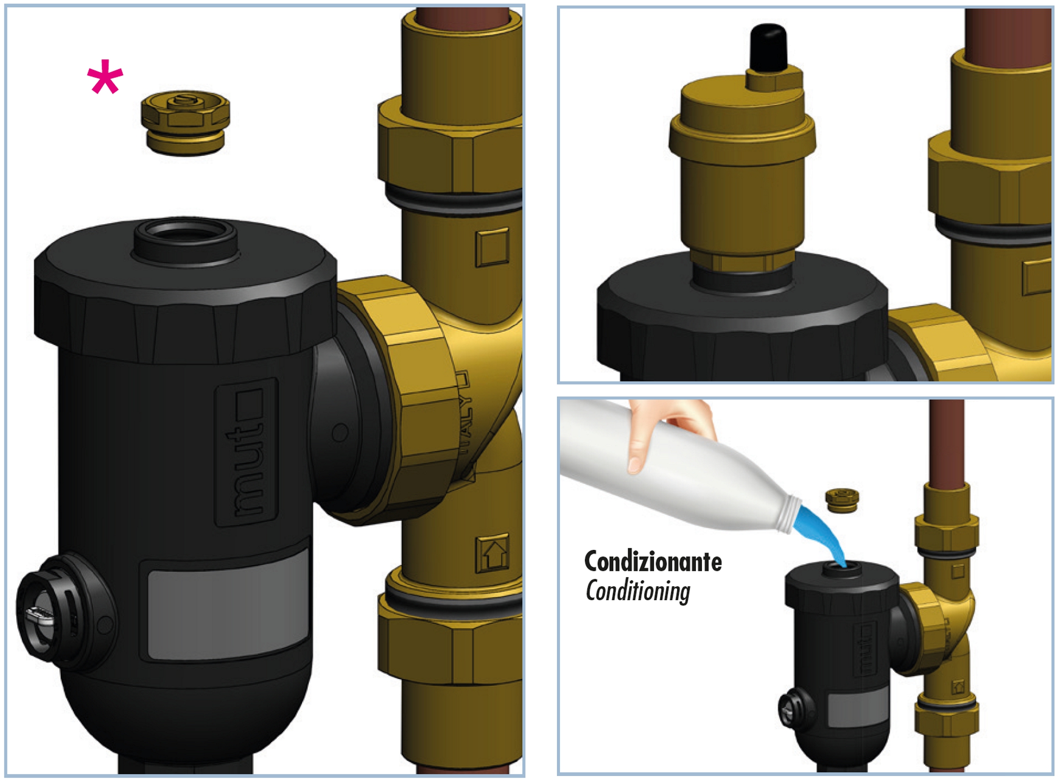 Lo sfiato aria ad apertura manuale può essere sostituito con lo sfiato aria automatico (richiedere codice MUT 5.030.01343) nel caso sia ritenuto opportuno e in funzione delle posizioni relative dei condotti idraulici dell’impianto. Lo stesso attacco può essere utilizzato per inserire il condizionante nell’impianto.