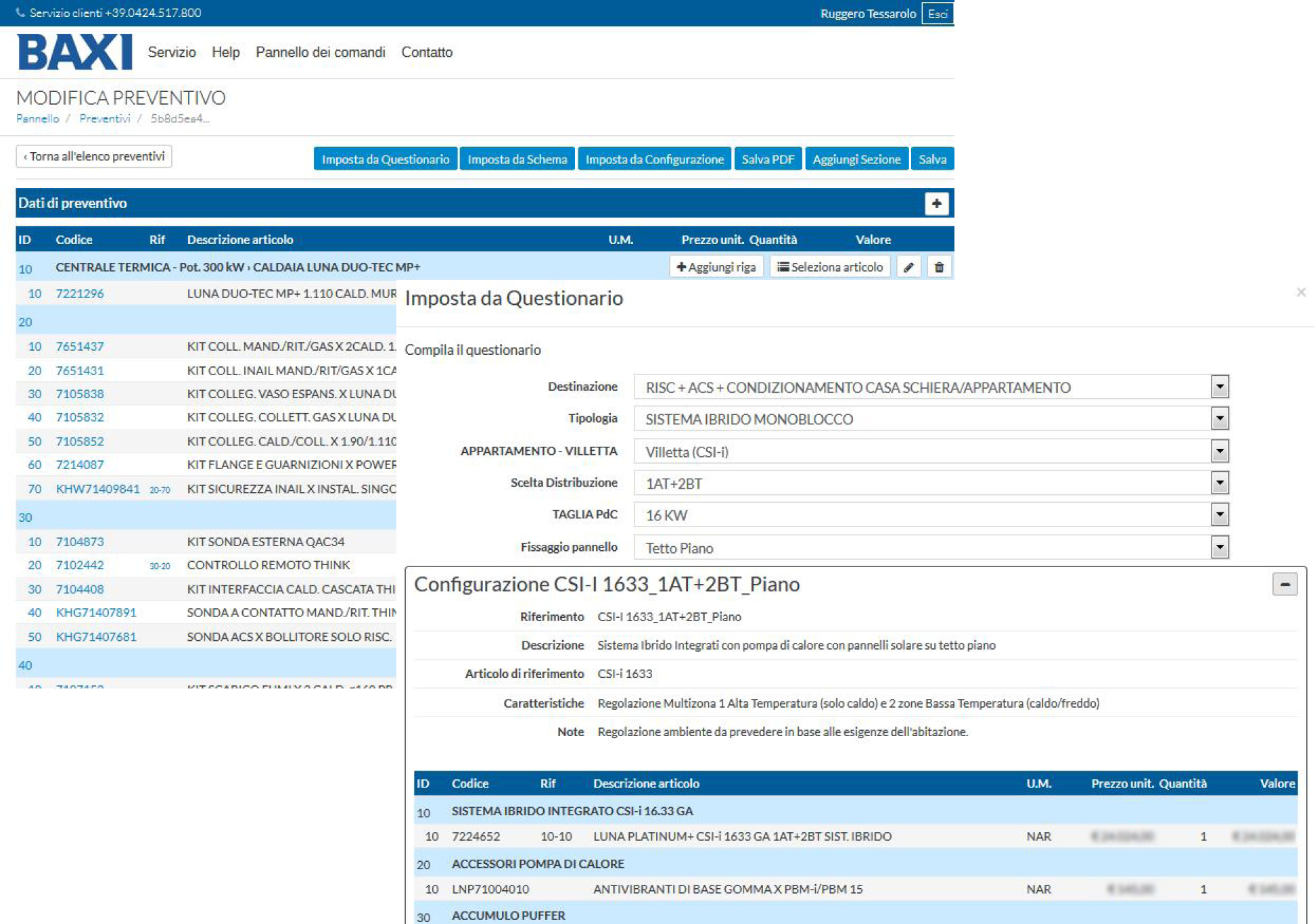 Uno degli strumenti che mettiamo a disposizione sul sito ufficiale www.baxi.it, nella sezione dedicata del menù Baxi per professionisti, è il servizio di preventivazione on line. Grazie a questo sistema il progettista è in grado di creare in totale autonomia il preventivo, scegliere l’impianto più idoneo a ogni tipo di esigenza o avere a disposizione la lista dei materiali necessari per la realizzazione dell’impianto effettuando la selezione di una configurazione oppure di uno schema idraulico o attraverso un questionario. On line sono già caricate 300 “configurazioni tipo” di preventivo. Il progettista potrà salvare il preventivo, personalizzarlo e creare così un archivio storico, immediatamente consultabile, che contiene codici, quantità, accessori, disegni tecnici e schemi d’impianto.