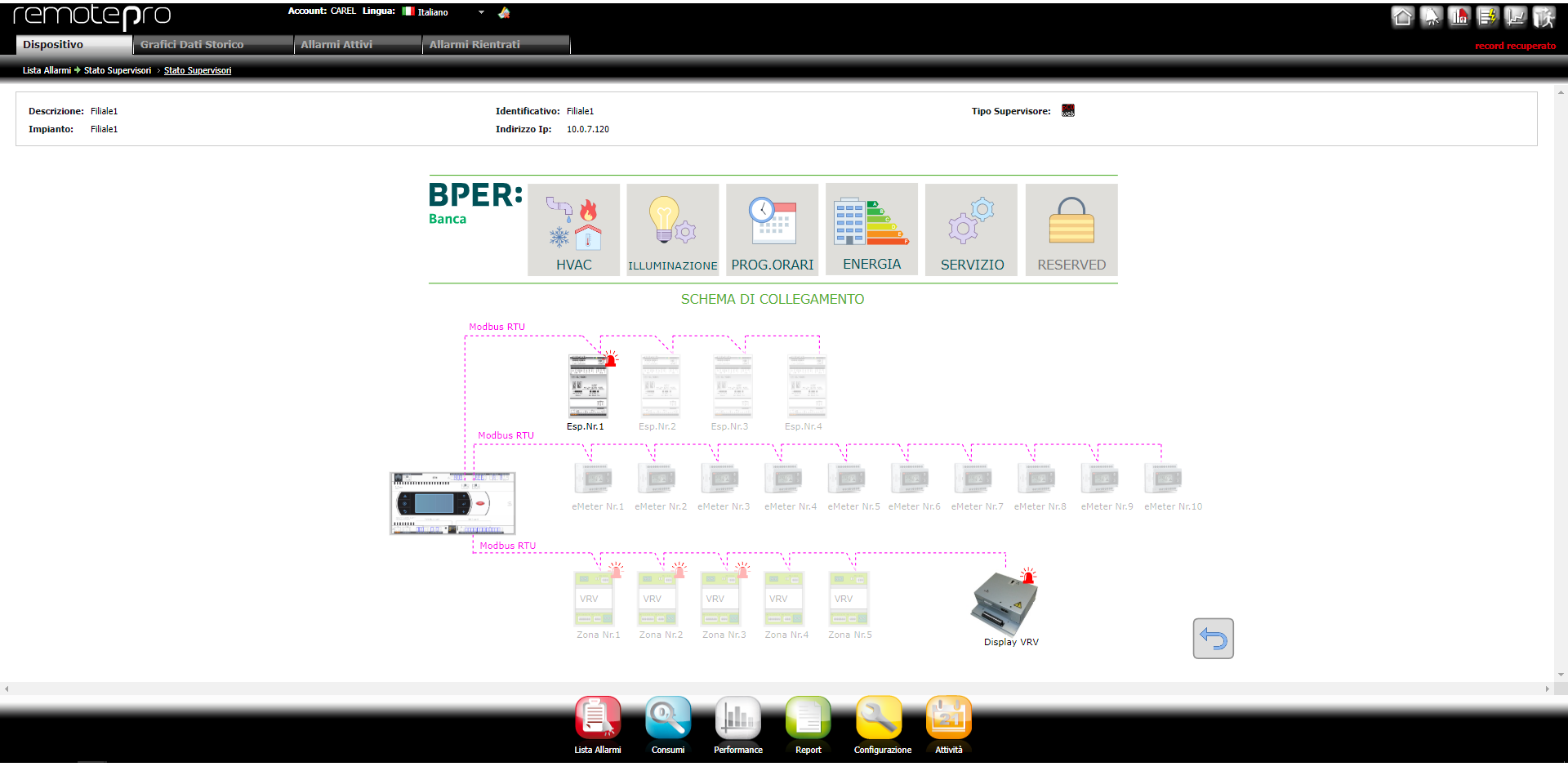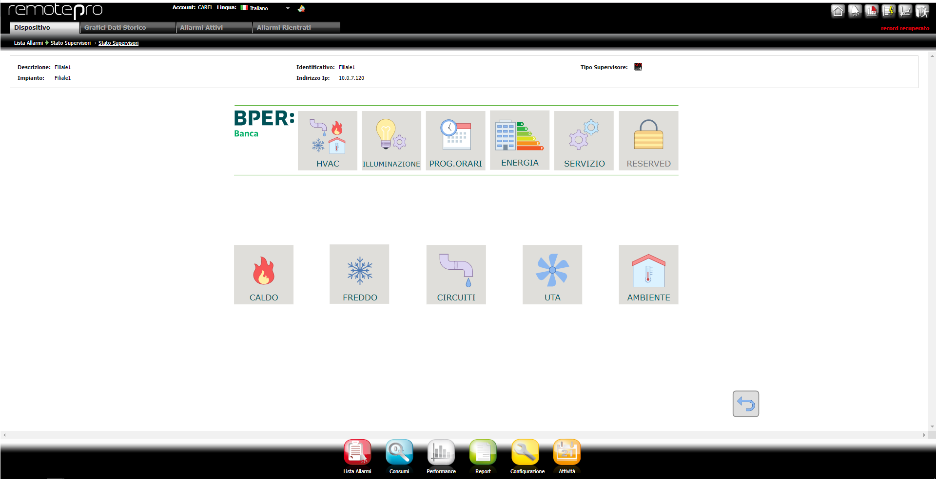 Mainpage di accesso alle funzionalità del BEMS Carel