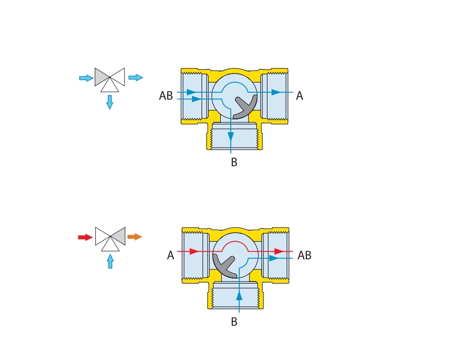 Questa configurazione è principalmente utilizzata per le regolazioni di temperatura, sfruttando la miscelazione di flussi in ingresso a temperature diverse allo scopo di ottenere la temperatura desiderata in uscita. Se invece la valvola presenta un ingresso e due uscite, viene detta valvola deviatrice. In questo modo di funzionamento il flusso proveniente dalla via comune “AB” viene deviato verso le porte “A” o “B”. Di conseguenza, le posizioni intermedie dell’otturatore determina- no una precisa quota di ripartizione del flusso tra le due vie di uscita. Grazie a questa modalità di funzionamento, le valvole a tre vie in configurazione deviatrice sono utilizzate per il controllo della portata, senza però variare il flusso in ingresso alla valvola.
