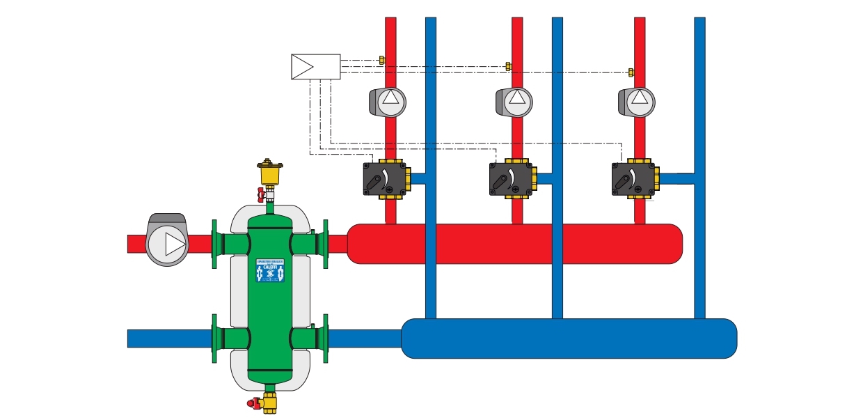Le valvole miscelatrici trovano applicazione negli impianti in cui è richiesta la regolazione della temperatura. Lo schema di installa- zione tipico è quello del “circuito di miscelazione”, tramite il quale viene controllata la gestione del grado di apertura della valvola miscelatrice (figura 4). In questo modo, infatti, il flusso in mandata può essere opportunamente miscelato con quello di ritorno. La pompa del circuito utenza preleva direttamente la portata dal circuito primario.