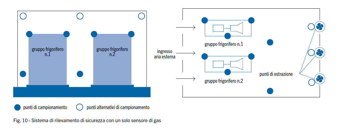 L’impiego di un singolo punto di rilevamento risulta generalmente sufficien­te per determinare se l’aria del locale è sicura. Per ottenere un ef­ficace e immediato rilevamento delle perdite, tuttavia, il numero di punti di rilevamento dovrebbe essere associato al numero dei comuni punti di perdita dei gruppi frigoriferi.