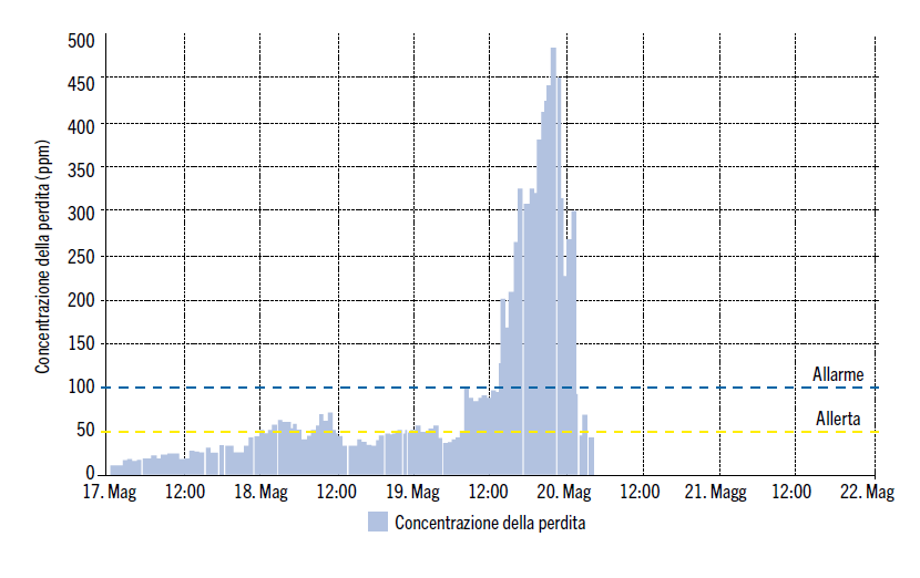Questo scenario potrebbe comportare in 10 anni di vita utile della macchina una perdita totale di 1600 kg di refrigerante, dato che la bassa concentrazione non attiva l’allarme da parte di un rilevatore di gas a diffusione. Pertanto, in base alla dimensione e alla quantità delle perdite e alla loro tendenza a diffondersi a causa della ventilazione forzata o ad ac­cumularsi a causa delle differenze di densità, i rilevatori di gas di sicurezza non forniscono un allarme tempestivo in caso di per­dite contenute.