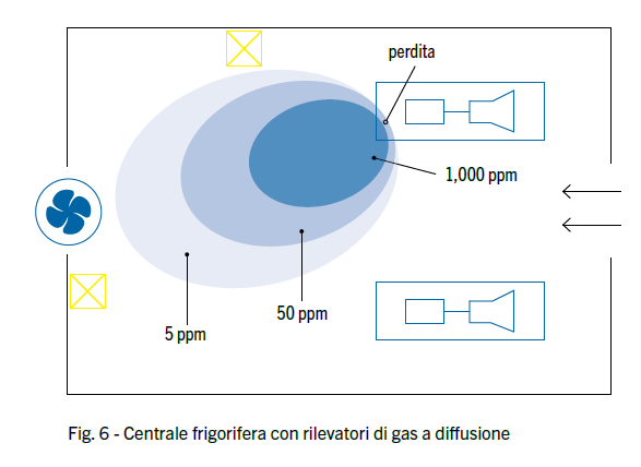 La figura 6 mostra una centrale con un volume di 300 m3 con tre gruppi frigoriferi che contengono decine di kg ciascuno di refrigerante. Una tipica centrale potrebbe avere una ventilazione da 5 a 10 ricambi orari, anche se una buona prassi ingegneristica è di avere fino a 15 ricambi.