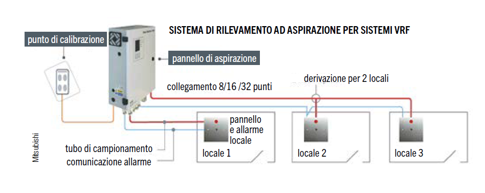 Per la gestione dei sistemi VRF sono invece disponibili sistemi ad aspirazione con sensori e tubazioni per il campionamento, in grado di monitorare fino a 32 locali da un solo pannello. Il sistema effettua un autocontrollo continuo e rileva immediatamente qualsiasi perdita di refrigerante attivando un allarme e provvedendo al recupero automatico del refrigerante con ciclo di pump-down mediante sezionamento dei circuiti ottenuto con valvole a sfera motorizzate.
