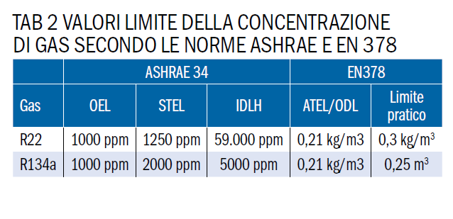 Altri valori limite degli standard di sicurezza, oltre all’OEL, sono il limite per esposizione di breve du­rata (STEL), con un TWA di 15 minuti, il pericolo immediato per la vita e la salute (IDLH), il limite di mancanza di ossigeno (ODL), il limite di esposizione alla tossicità acuta (ATEL) e il limite pratico. La tabella 2 mette a confronto i diversi valori limite previsti dalle norme ASHRAE e EN 378.
