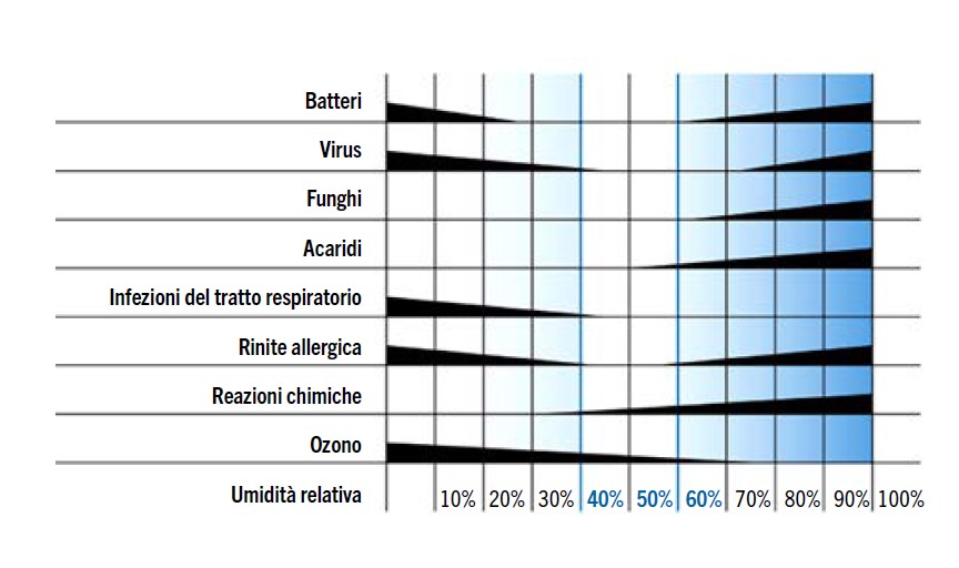 Il diagramma Scofield/Sterlin illustrato in figura 3 riporta le correlazioni rilevanti in termini di comfort e di tutela della salute a diversi livelli di umidità dell’ambiente. Il rischio causato da microorganismi indesiderati e il manifestarsi di sintomi patologici specifici sono minimi entro il range ottimale del 40-60 % di umidità relativa.