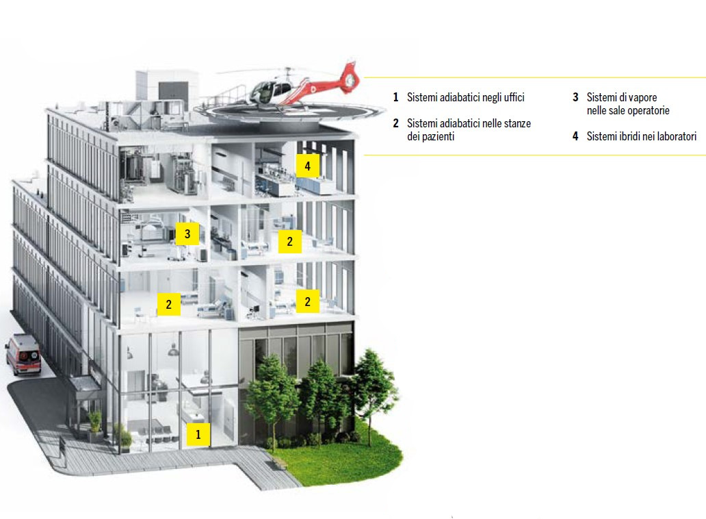 Negli ospedali, in molte aree esiste un rischio maggiore di contrarre cosiddette infezioni nosocomiali, ovvero malattie originate all’intero di un ospedale. Queste infezioni sono comunemente denominate IOS (Infezioni nelle Organizzazioni Sanitarie). Per mantenere basso questo rischio di infezione, è necessario trattare l’aria ambiente. L’aria deve essere condizionata in modo tale che, in termini pratici, i patogeni non abbiano possibilità di sopravvivenza. Il raggiungimento di condizioni interne ottimali richiede l’ottenimento della temperatura desiderata insieme a un livello di umidità relativa compreso tra il 40 e il 60 percento. Pertanto, l’aria esterna aspirata deve essere umidificata o deumidificata in un impianto di condizionamento centralizzato indipendentemente dal periodo dell’anno.