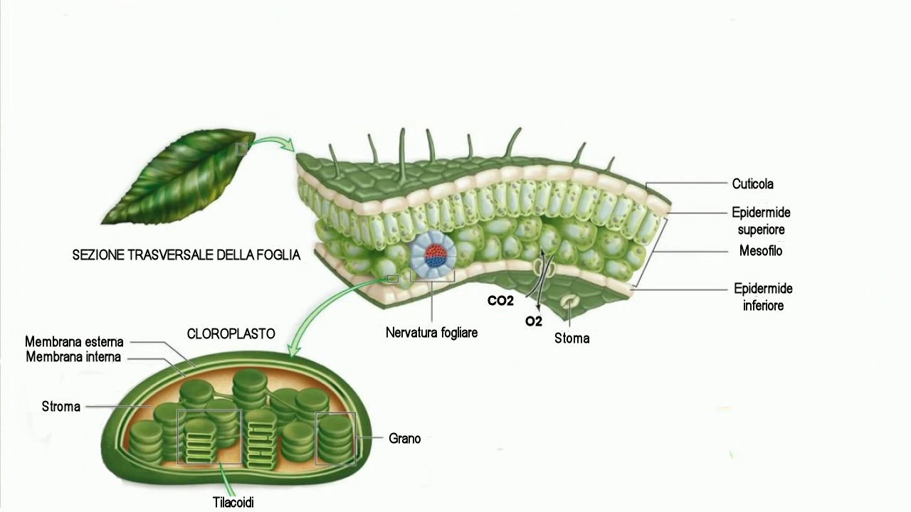 La fotosintesi avviene nella foglia, ed in modo specifico nei cloroplasti, organelli cellulari contenenti molecole di clorofilla in grado di catturare la luce solare.