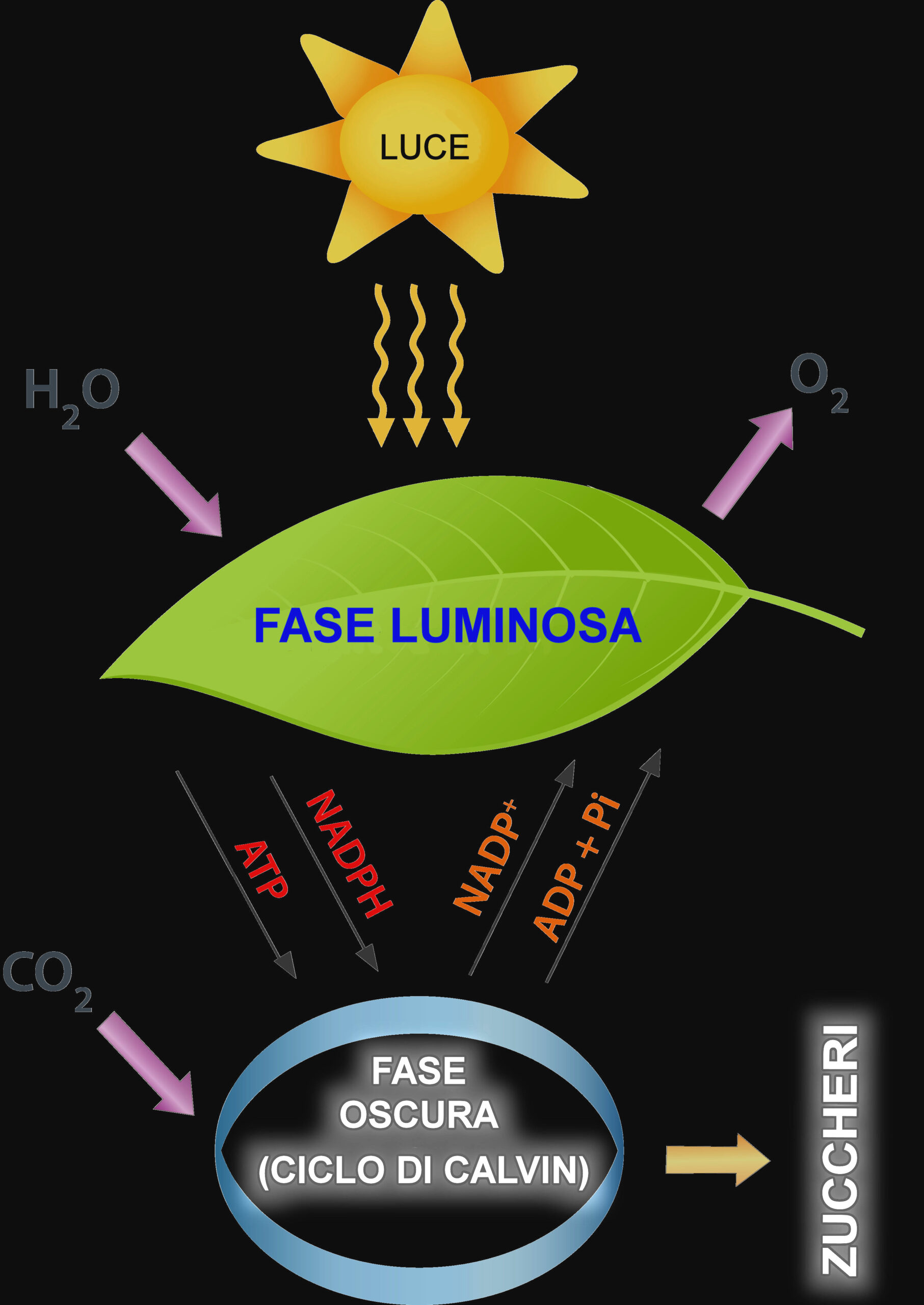 Le fasi della fotosintesi clorofilliana: nella fase luminosa si produce energia chimica tramite l’energia luminosa, mentre nella fase oscura avviene la fissazione del carbonio in molecole organiche.