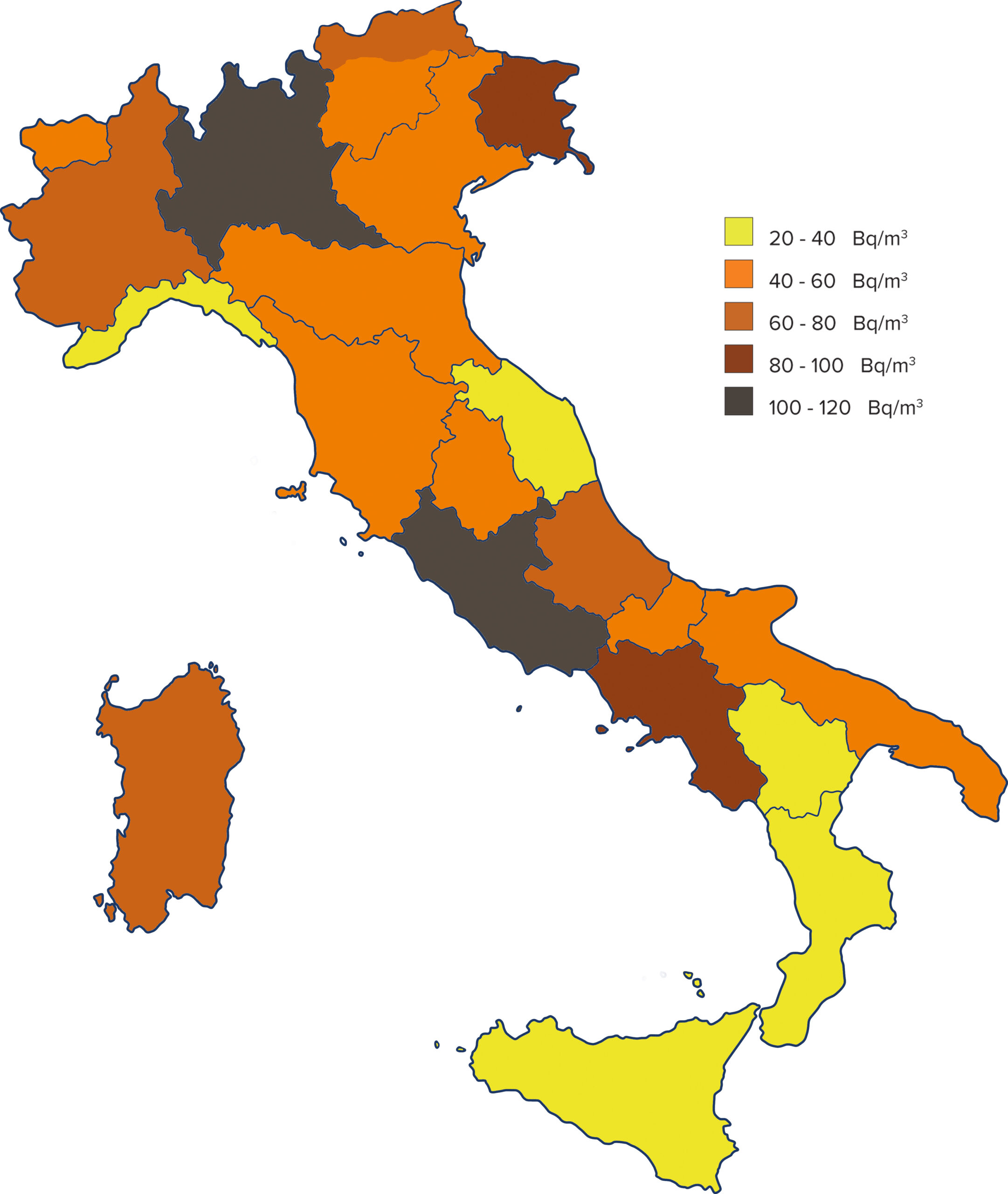 Inoltre, i risultati dell’indagine nazionale aggregati per regione mostrano una situazione molto diversificata, con una maggiore concentrazione in Lombardia e Lazio, dove si attestano picchi di Bq maggiori di 100/m³. Si sono verificati anche casi di singole abitazioni che sono arrivate ad avere concentrazioni fino a migliaia di Bq/m³.