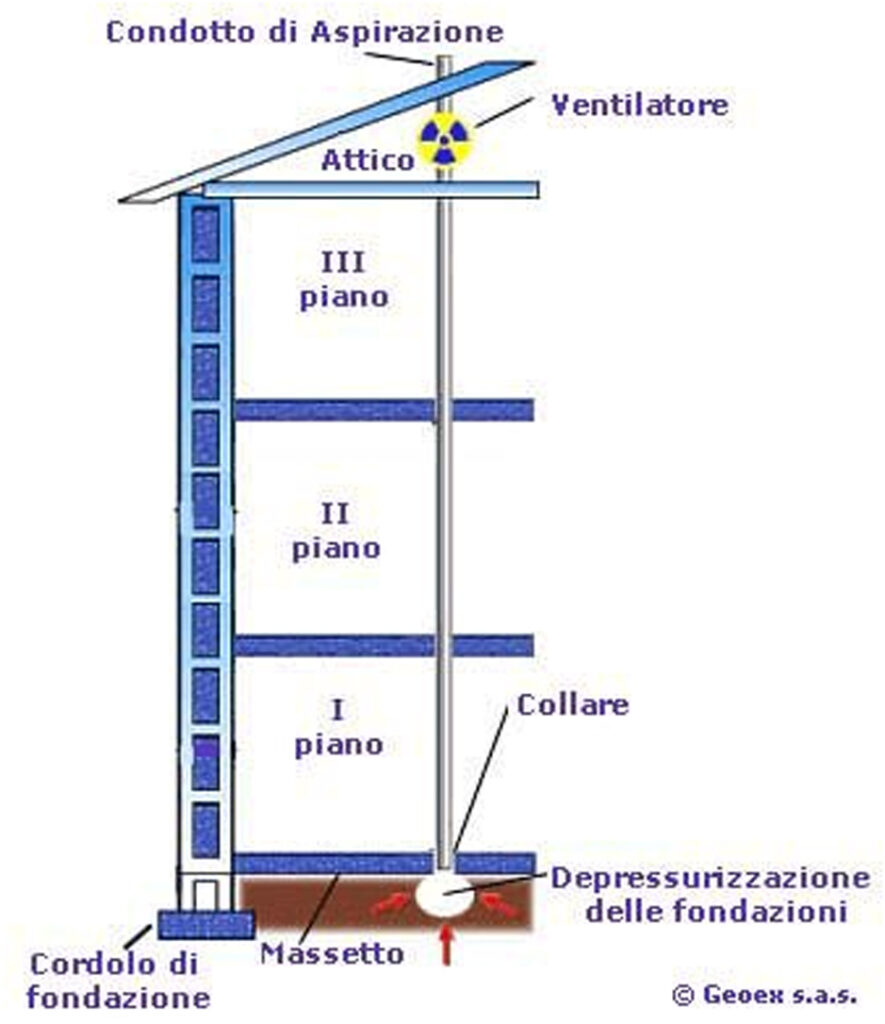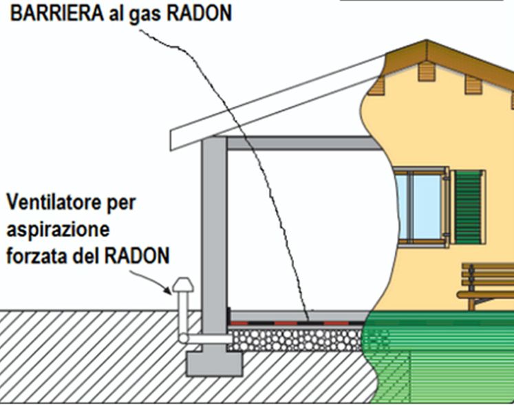 Per ostacolare la penetrazione di radon dal suolo attraverso l’involucro degli edifici possono essere messe in atto diverse strategie come l’utilizzo di guaine impermeabili al gas posate in corrispondenza delle fondamenta, l’accortezza di sigillare tutte le crepe, fessure o fughe; la creazione di un vespaio ventilato; l’aspirazione dell’aria direttamente dal sottosuolo (fig.3) e, infine, l’aerazione dei locali o la loro ventilazione.