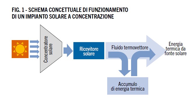 Gli impianti solari a concentrazione convertono l’energia solare in calore a medio/alta temperatura utilizzando due principali componenti: il campo solare e il ricevitore. Nel campo solare, il concentratore, costituito da un sistema di specchi mobili, riflette la radiazione solare diretta e la focalizza, aumentandone l’intensità da alcune decine fino ad oltre un migliaio di volte, su un ricevitore, dove avviene la trasformazione dell’energia solare in energia termica. All’interno del ricevitore scorre un fluido termovettore, che assorbe l’energia termica prodotta e permette di trasferirla in altre parti dell’impianto e all’utilizzatore finale.