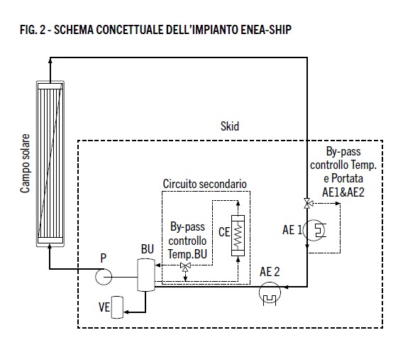 «Il campo solare è attualmente connesso a un circuito ad olio con una temperatura operativa massima di 320 °C e una potenza termica nominale di circa 200 kW. Tale circuito include una caldaia elettrica (CE), funzionale al preriscaldamento dell’olio diatermico; un buffer (BU), uno scambiatore di processo olio-aria (AE1), che simula i carichi delle utenze finali, soprattutto in termini di temperature operative; un secondo scambiatore di servizio olio-aria (AE2), un vaso d’espansione (VE) pressurizzato con linea di azoto (circa 6 atm) e una pompa centrifuga di rilancio (P), per la circolazione dell’olio diatermico nell’impianto sperimentale.
