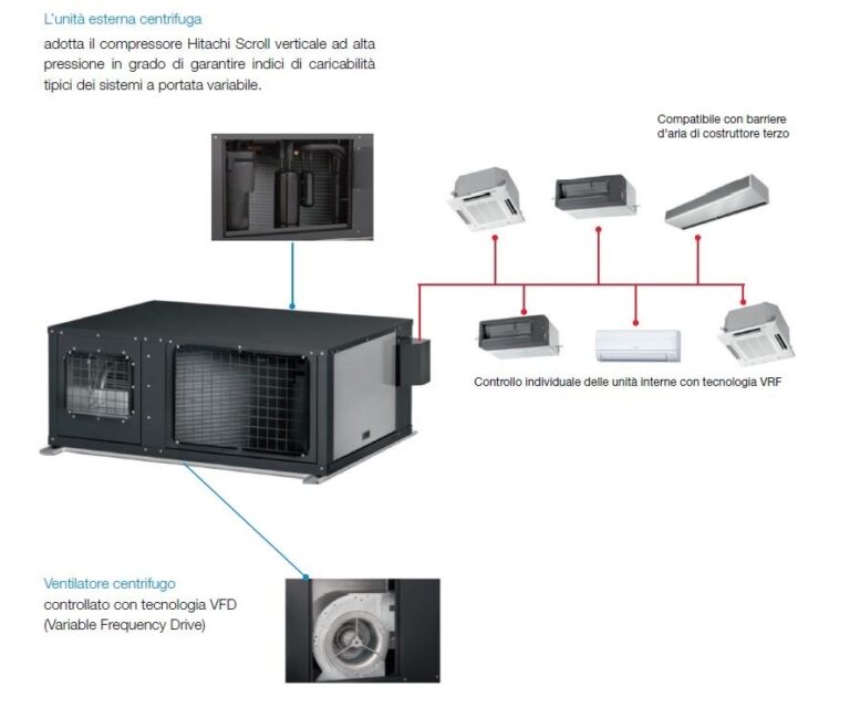 Le unità VRF centrifughe RASC-HNPE proposte da Hitachi offrono una grande flessibilità di installazione. Possono essere installate internamente con una semplice canalizzazione, soluzione ideale quando gli spazi d’installazione all’esterno sono limitati o vietati. Accettano diverse configurazioni con pannelli intercambiabili per mandata e ripresa aria, adattando velocemente l’installazione alle esigenze del posizionamento. Mandata e ripresa possono…