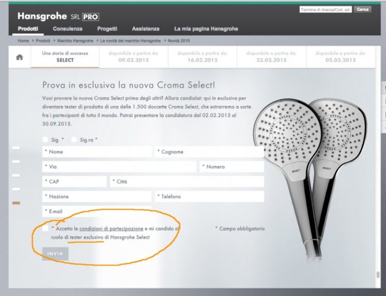 Fino al 30 Settembre 2015 collegandosi al sito Hansgrohe.it compilando il modulo nell’immagine è possibile provare in esclusiva una delle 1500 nuove doccette Croma Select Hansgrohe. Nelle versioni tonda o quadrangolare, le nuove docce sono già disponibili per il mercato italiano e chi avrà aderito all’iniziativa sarà un ’tester ufficiale’ dei nuovi getti e dell’esclusivo brevetto…