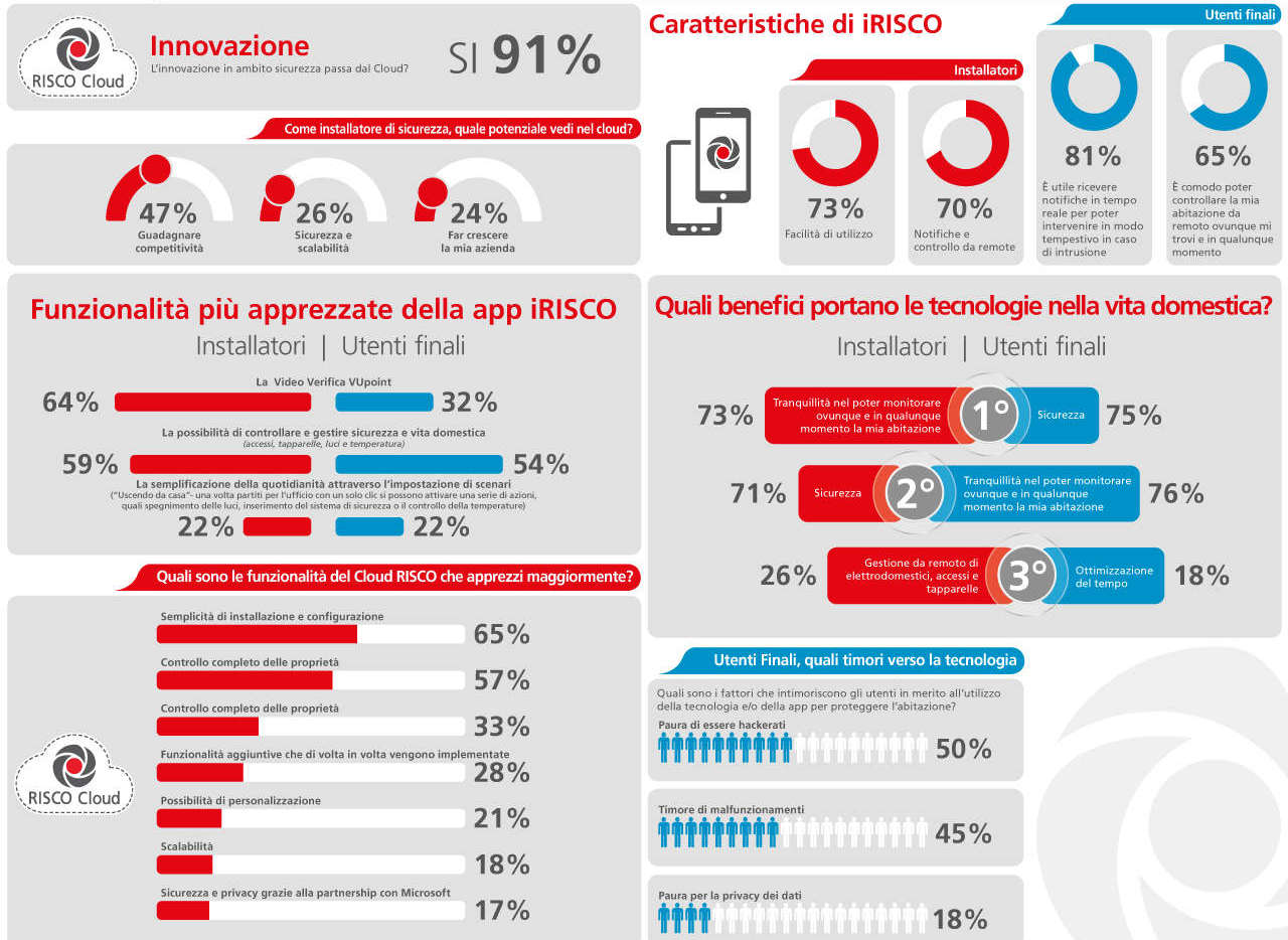 «In RISCO Group riteniamo fondamentale avere un dialogo costante con chi ogni giorno lavora con i consumatori e con le nostre soluzioni, per aiutarci a cogliere, e quando possibile anticipare, le evoluzioni del mercato. Abbiamo quindi deciso di coinvolgere i nostri installatori e gli utenti in un’indagine su un tema significativo e particolarmente attuale per il comparto della sicurezza: il cloud. Da sempre impegnati a fare innovazione, investendo in Ricerca e Sviluppo per fornire soluzioni e tecnologie che rappresentino lo stato dell’arte nel settore della sicurezza e che soddisfino al meglio le esigenze in continua evoluzione degli utenti, siamo orgogliosi di apprendere che anche i nostri installatori sono consapevoli del ruolo di primaria importanza del cloud oggi e per la futura evoluzione del comparto».