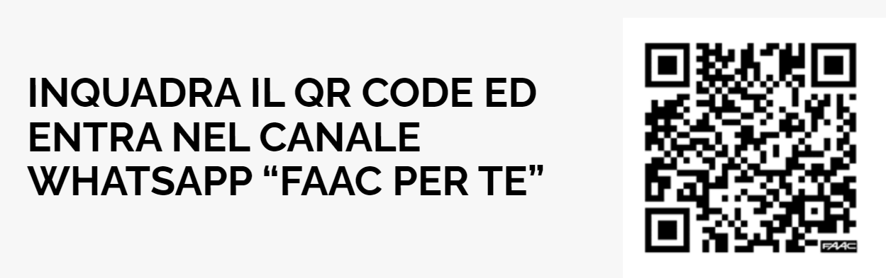 Per iscriversi al canale “FAAC per Te” basta scansionare il QR code nell’immagine, cliccare il link al sito web, consentire alla pagina di collegarsi a WhatsApp. Quando si apre il canale si può cliccare su “Segui” per restare sempre in contatto con il mondo di FAAC. In alternativa, basta cercare “Faac per Te” tra i canali WhatsApp esistenti.