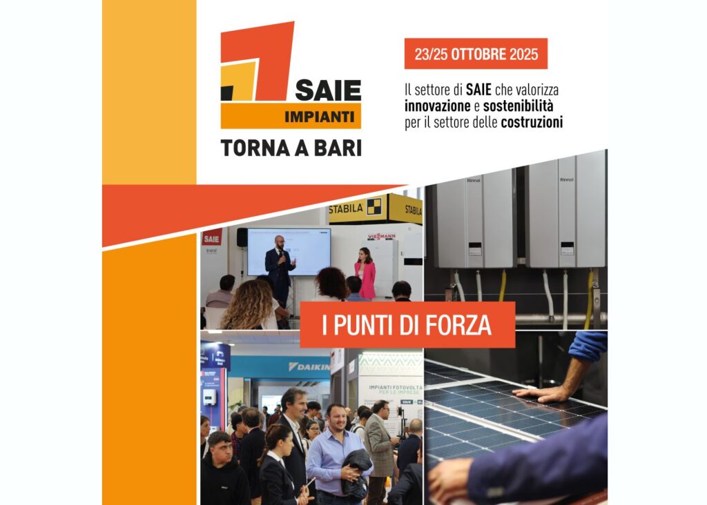 Nell’ambito della quarta edizione di SAIE Bari (Nuova Fiera del Levante, 23-25 ottobre 2025), torna SAIE Impianti, il settore tematico ed espositivo verticale di SAIE – La Fiera delle Costruzioni: progettazione, edilizia, impianti – che si svolgerà nel capoluogo pugliese, proseguendo l’alternanza strategica con la sede storica di Bologna.