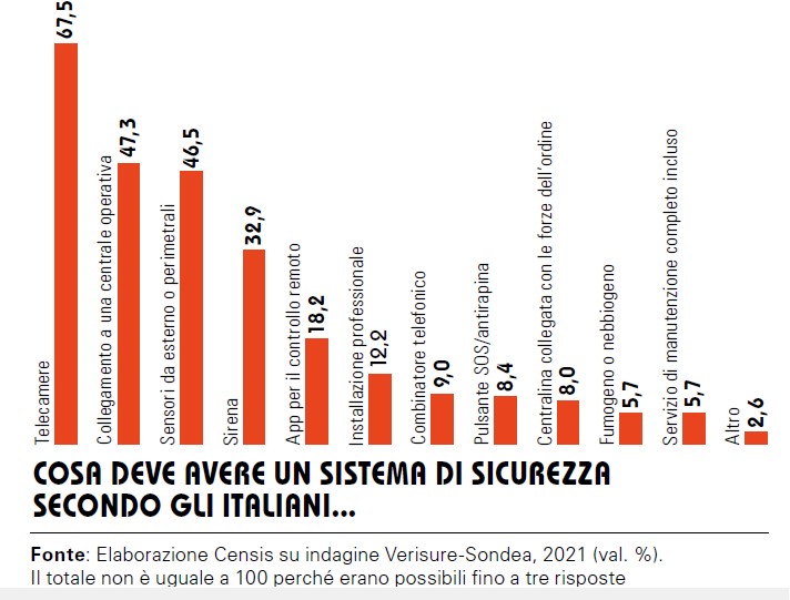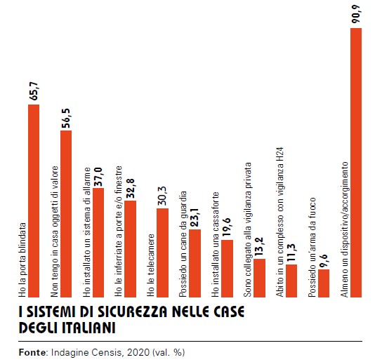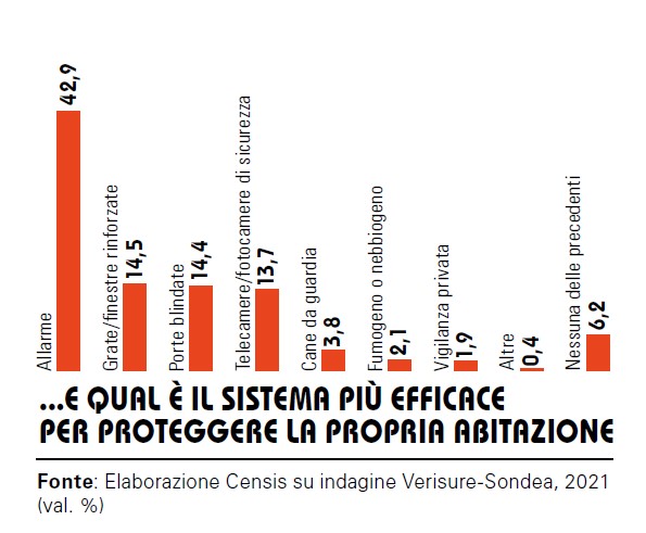 I dati indicano che sono cresciute le paure degli italiani, con riferimento non solo alla sicurezza fisica ma anche a quella digitale (291.835 le truffe e frodi informatiche registrate nel 2021); per quanto riguarda invece i numeri relativi ai crimini, i reati come furti e rapine nelle abitazioni sono diminuiti (-9,2% prendendo come riferimento il 2019), ma restano una minaccia reale, con un +4,3% nel 2021.