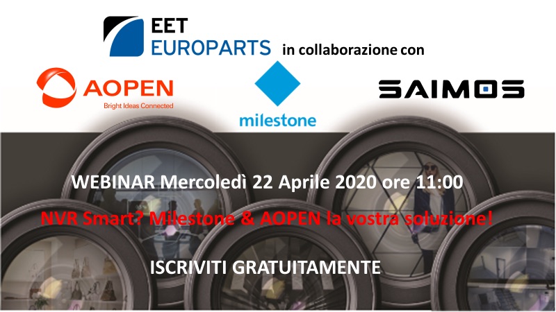 Tecnologie e progettazione nella videosorveglianza, oltre a un focus su queste soluzioni, saranno gli argomenti del webinar gratuito dal titolo: NVR Smart? Milestone & AOPEN la vostra soluzione!, organizzato da EET Europarts in collaborazione con Milestone Systems per il prossimo 22 aprile alle ore 11.00. In qualità di relatori interverranno Rosario Villa, progettista ed esperto tecnico certificato Milestone e Nadia Cocchi, entrambi della divisione Security di EET Europarts, con loro sarà presente Claudio Fassiotti di Milestone Systems. Per info e iscrizioni cliccare QUI.