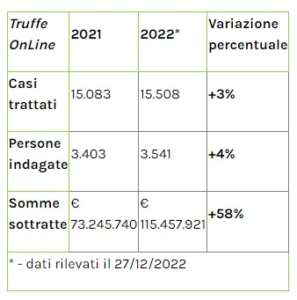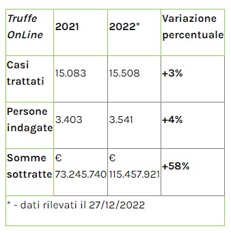 Nell’ambito delle truffe sul web, anche nel corso del 2022, importante l’incremento degli illeciti legati al fenomeno del trading online (3.020 i casi trattati, 130 le persone), con l’aumento del numero di portali che propongono programmi speculativi, apparentemente redditizi, e l’utilizzo di tecniche molto sofisticate per contattare le vittime. L’attività investigativa, qualora la denuncia sia tempestiva, prevede l’immediata attivazione dei canali di Cooperazione Internazionale di Polizia, con la richiesta del blocco urgente delle somme versate e l’espletamento di accertamenti sui flussi finanziari normalmente destinati all’estero.