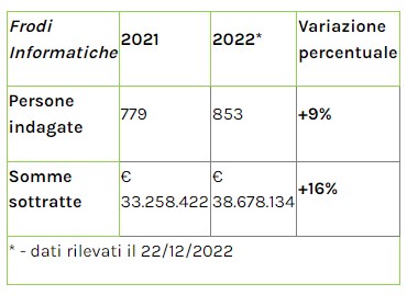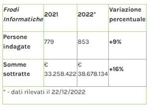 In merito ai fenomeni di phishing, smishing e vishing, tecniche utilizzate per carpire illecitamente dati personali e bancari, per operare sui sistemi di home banking, sono state identificate edindagate 853 persone (+9% rispetto all’anno precedente).