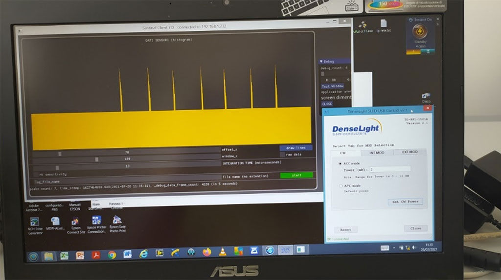 - un sistema dedicato opto-elettronico di interrogazione dei sensori in fibra ottica, acquisizione e condizionamento del segnale, realizzato utilizzando componentistica commerciale e ottimizzato per questa specifica applicazione, con riferimento a numerosità e tipologia dei sensori, ampiezza e regime dinamico del segnale atteso. Il sistema applica in real time algoritmi di condizionamento del segnale e soppressione del rumore;