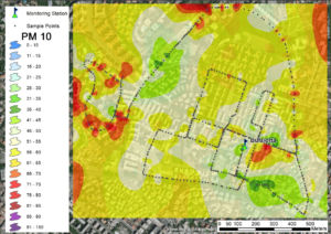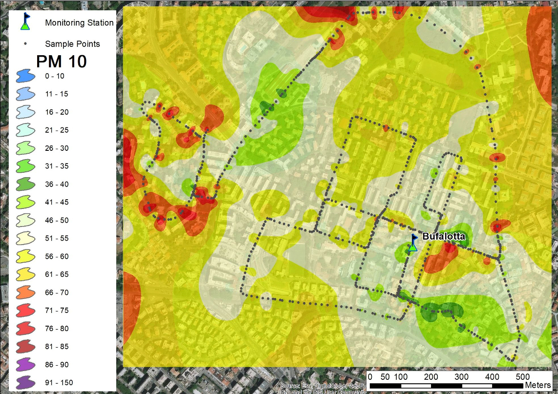 Figura 1. Esempio di mappa della concentrazione di particolato elaborata in CIPCast a partire dalle misure da un veicolo equipaggiato col sensore di qualità dell’aria (punti grigi)
