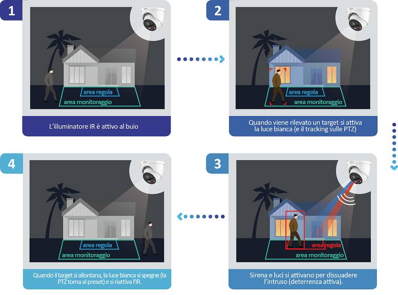 Le telecamere TiOC 2.0 integrano gli Smart Dual Illuminator che passano automaticamente da IR a luce bianca. Grazie agli algoritmi deep learning, il LED supplementare si attiva solo quando viene rilevato un target nell’area di monitoraggio (oltre al tracking nelle PTZ). Se il target infrange una regola, si attivano anche la sirena e le luci blu e rosse; non appena il target si allontana dall’area monitorata, la luce bianca supplementare si spegne (la PTZ torna al preset) e si riattiva l’IR, così da ridurre notevolmente l’inquinamento luminoso.