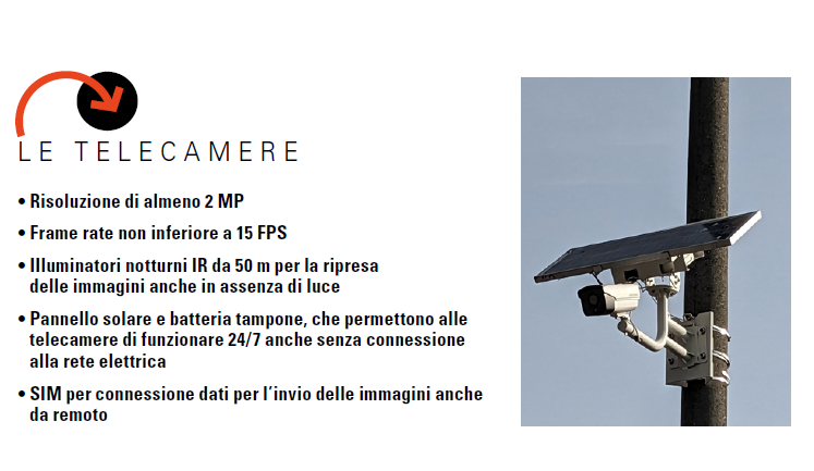 Le caratteristiche tecniche sono adeguate agli scopi delle soluzioni: risoluzioni di almeno 2 MP, frame rate adattato alla disponibilità di banda dati (comunque non inferiore a 15 FPS), illuminatori IR da 50 metri; l’alimentazione solare, ove presente, garantisce l’operatività per più giorni, senza perdita di servizio, anche nei periodi invernali meno favorevoli. La videoanalisi standard a bordo permette l’ottimizzazione del funzionamento della telecamera, attivando le registrazioni solo al verificarsi di eventi specifici».