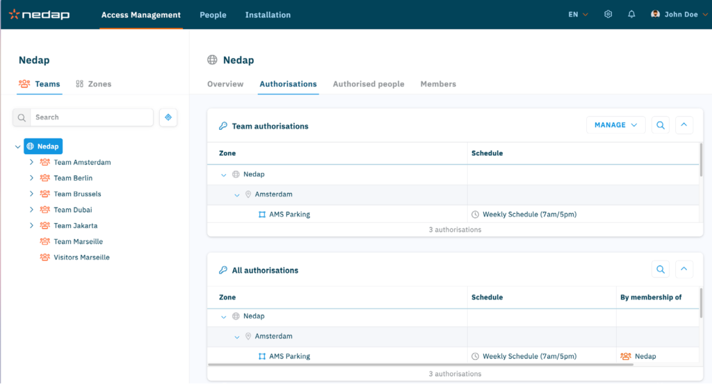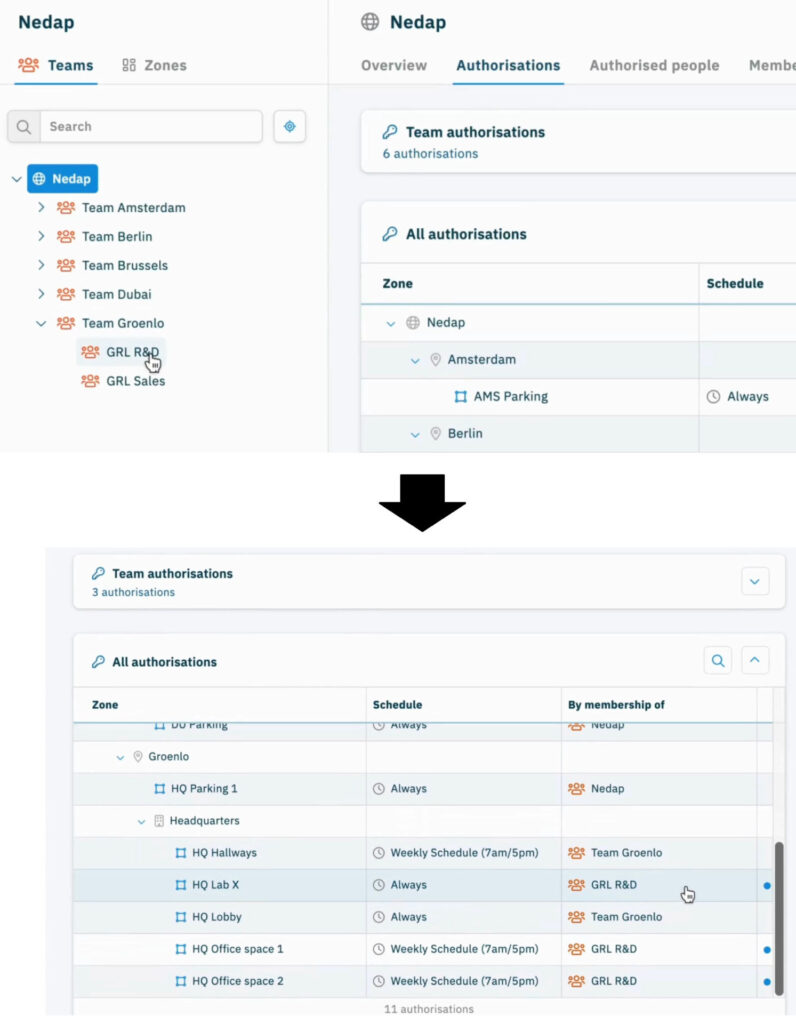 Access AtWork adotta un modello di autorizzazione unico che consente agli amministratori di gestire l’accesso in base a team e zone gerarchiche. La combinazione di questo motore di autorizzazione intelligente con un’interfaccia intuitiva semplifica il lavoro degli amministratori nella gestione degli accessi a siti diversi, senza richiedere tempi lunghi né investimenti nella formazione del personale.