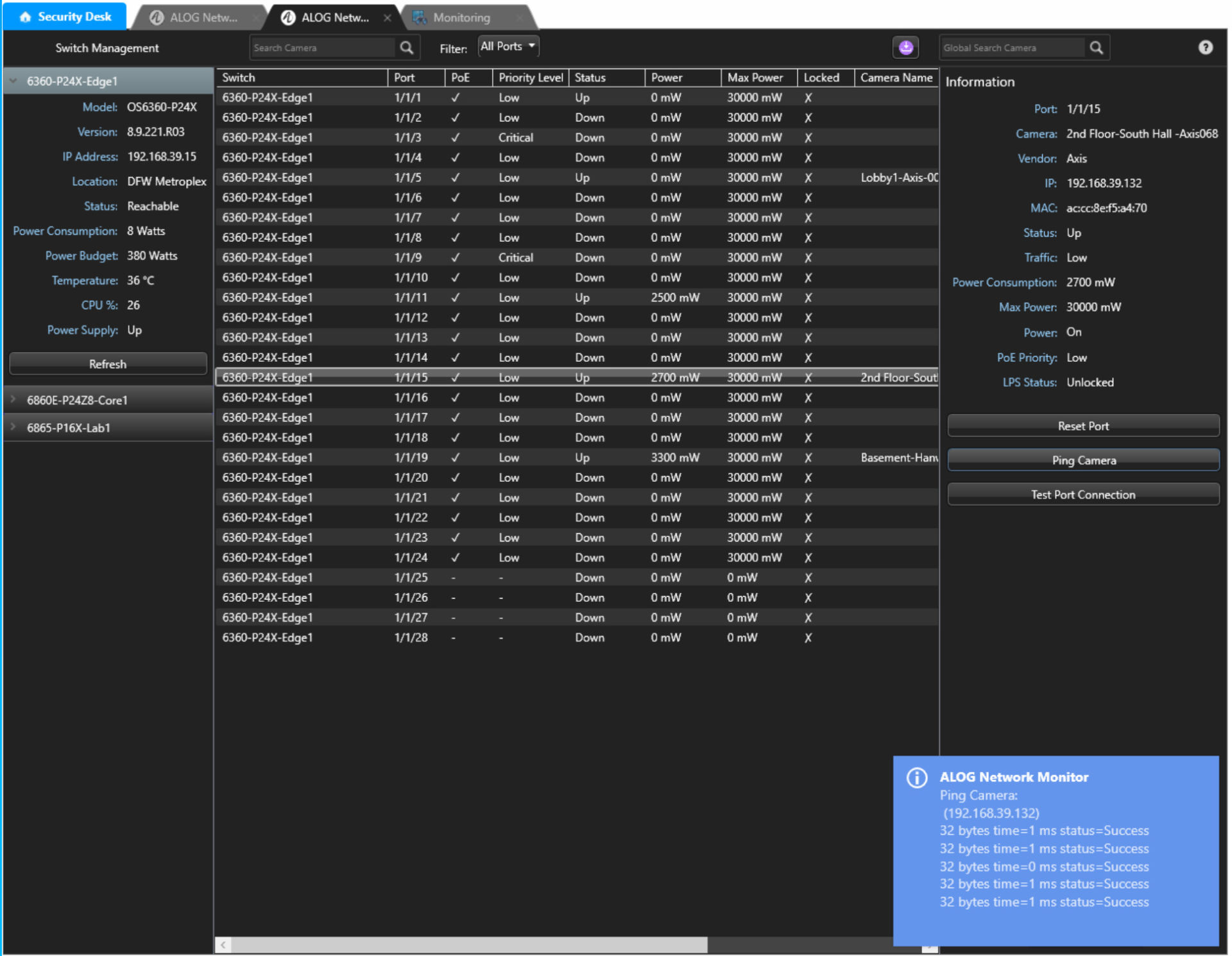 Efficiente risoluzione dei problemi con un solo clic: è possibile eseguire test con un solo clic per valutare lo stato della telecamera e avviare i ripristini al volo, oltre che personalizzare la priorità Power over Ethernet (PoE) in base alla telecamera.